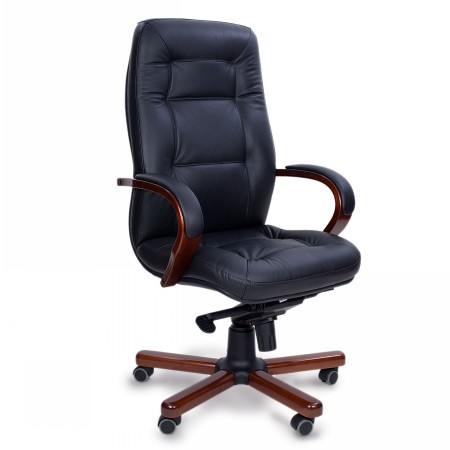 Кресло руководителя с плавными линиями и обтекаемыми формами, надежно поддерживает спину во время работы. Прочные подлокотники помогают удобно расположить руки, для повышения уровня комфорта сверху прикреплены мягкие накладки. Материал: натуральная кожа, задняя часть спинки – кожзам; Подлокотники кресел - шпонированная гнутоклеенная фанера, накладки кожаные; Основание: металлическое, накладки из массива бука; Мультиблок: механизм наклона с фиксацией в 4-х положениях; Регулировка жесткости качания под вес сидящего; Прорезиненные колеса; Газ-патрон 3-ей категории стабильности (DIN 4550 class 3), категория повышенной надёжности: газ-патрон выдерживает нагрузку в 200.000 циклов при динамической стендовой нагрузке в 80 кг. Минимальное давление, при котором срабатывает газ-патрон - 21,5 кг, максимальное - около 150 кг.
