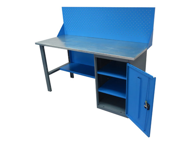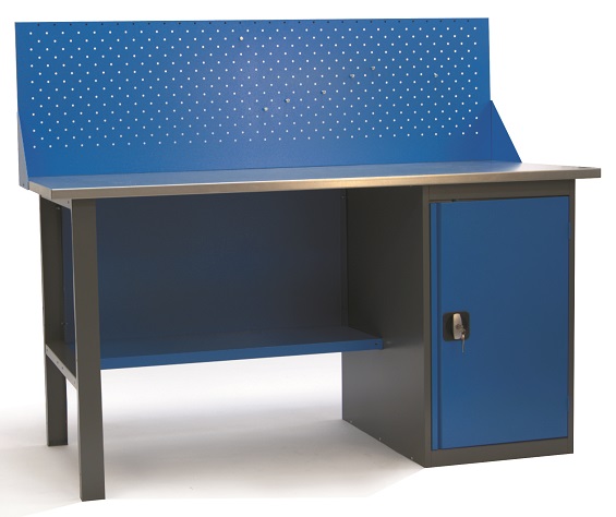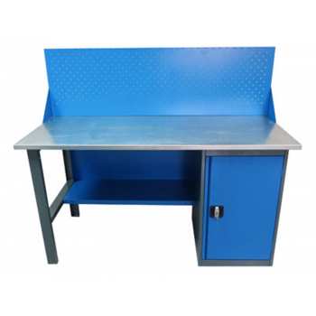 Верстаки, представленные в каталоге, имеют усиленную модульную конструкцию, отличающуюся надежностью. Столешница - это плита МДФ толщиной 25 мм, покрытая листовым металлом из оцинковки. Дополнительная комплектация верстака; это удобная панель для хранения инструментов. Верстак имеет приставную тумбу с полками и ригельным замком. Дверка тумбы может менять свое расположение в зависимости от удобства мастера.